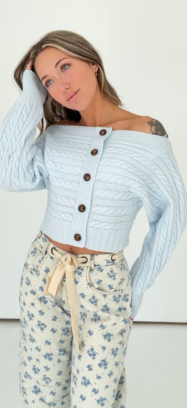 OFF-SHOULDER BUTTON DOWN SWEATER TOP